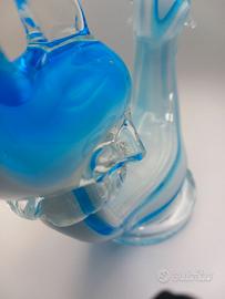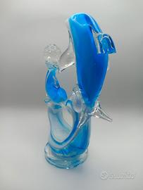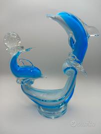 Scultura decorativa in vetro artistico stile Murano raffigurante due delfini su base ondulata. Colorazione blu e bianco con dettagli trasparenti, realizzata a mano. Oggetto molto decorativo. ⚠️ Presenta una piccola rottura su una pinna (visibile in foto), per questo motivo prezzo ridotto. Condizioni generali buone.