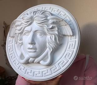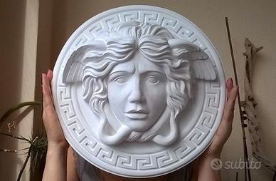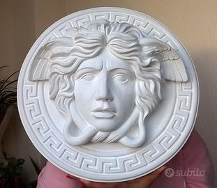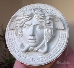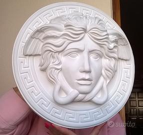 Scultura di Medusa della mitologia, modello con antica greca in stile tipo Versace con diametro di 38 cm, e una profondità di 11,6 cm. Pronta da appendere con aggancio sul retro, interamente lavorata a mano dall'artista, firmata, bianca tipo biscuit in purissimo gesso alabastro.
