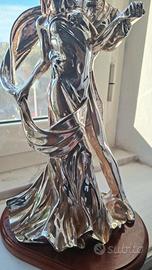 Vendo bellissima scultura in argento raffigurante due ballerini in abito elegante. I dettagli degli abiti fanno percepire la coppia in movimento. Base in legno. Presente qualche macchia che può essere rimossa con prodotti per pulire l'argento o comuni rimedi naturali. Peso della statua 4,7kg. Alta 47cm.