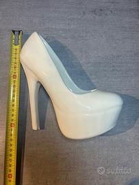 Elegante scultura di design raffigurante una scarpa con tacco alto, dallo stile moderno e scenografico.