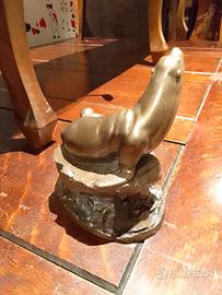 Bronzetto inglese realizzato nel 1980 firmato da Elton (Brian) del peso di 970 grammi con raffigurate femmina di otaria con cucciolo adagiate su scoglio. Dimensioni 12x9 cm. altezza 13 cm.