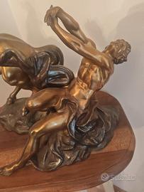 scultura in bronzo il cavallo e il guerriero parte classica di grande impatto visivo punto descrizione vendo splendida sculture in bronzo patinato rassicurante un cavallo rampante e un uomo disteso in posa drammatica, probabilmente ispirata alla mitologia classica o a scene erotiche di lotta tra uomo e natura. l'opera è realizzata con grande maestria i due punti i dettagliati anatomici del cavallo e del corpo maschile sono scolpiti con precisione dinamismo, trasmettendo forze” tensione in movimento. il contrasto tra le superfici lisce e quelle più lavorate esatte alla luce e dona tridimensionalità alla scena punto caratteristiche tecniche materiale bronzo patinato stile neoclassico romantico tecnica fusione a cera persa per presumibilmente base legno massello dimensione approssimativamente altezza 40 cm larghezza 30 cm profondità 20 cm peso 6 kg perfetta per collezionisti d'arte amanti del bronzo arredamento classico e studi professionali salotti eleganti o ambienti in stile antico.