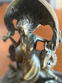 Splendida statua in bronzo raffigurante una donna elegantemente vestita con foulard e capelli al vento, accanto ad un bellissimo esemplare di cavallo .