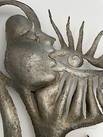 Scultura in ferro battuto dell'artista Borlandi realizzata negli anni 70 Misura 80 x 60 cm Rappresenta il Sole Realizzata a mano Utilizzabile sia come decorazione da parete che come lampada dato che ha il portalampadina installato. Vintage
