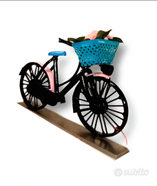 Propongo una rappresentazione di una bicicletta in maniera più fedele possibile. con un cestino in ferro, e al suo interno dei fiori fatti in stoffa.