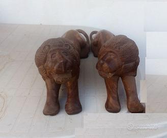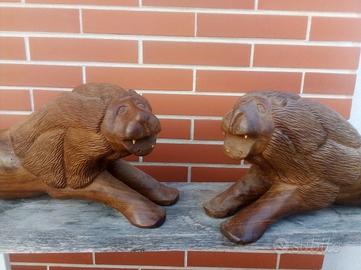 Scultura leoni intagliati su legno teak