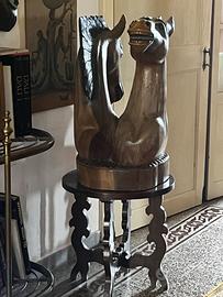 Scultura a soggetto equestre in legno duro orientale (teak) h. 80cm larghezza 50 cm venduto con supporto in legno (artigianato orientale) h. 60 cm