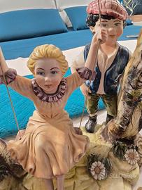 Raffinata scultura in porcellana Capodimonte, con marchio originale "N" sotto la base (vedi foto). La statua raffigura una scena romantica con altalena davvero funzionante, realizzata con grande cura dei dettagli. Dimensioni: 37 cm altezza, 34 cm larghezza, 19 cm profondità Stato di conservazione: eccellente, nessun difetto o restauro Marchio: "N" Capodimonte originale Anno di produzione: anni ’70-’90 Oggetto ideale per collezionisti o per arredare casa con eleganza