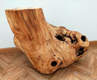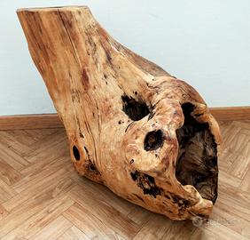 Scultura ornamentale ricavata da grossa radica di faggio. Pezzo unico! Radica scavata, lavorata e completamente asciutta. Già trattata con cera legno e olio di vasellina. Prodotti specifici per il legno, in odore e antiallergico. Fissata a semplice base in legno facilmente rimovibile ed eventualmente modificabile. Misure: 30x53x47 altezza