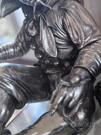il metallo viene lavorato manualmente a martello dall’interno per creare i volumi della figura e successivamente rifinito dall’esterno con cesellatura per definire i dettagli. Questa tecnica produce la tipica superficie leggermente martellata visibile in varie parti della scultura.