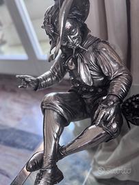 Scultura Pierrot giullare metallo argentato lavorazione a sbalzo H40.