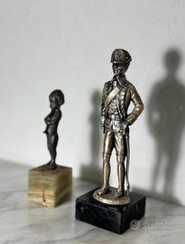 Statuetta decorativa raffigurante un soldato in uniforme, realizzata in metallo con finitura brunita e dettagli accuratamente modellati. La figura è montata su base in marmo nero, che ne valorizza la presenza e ne garantisce stabilità.