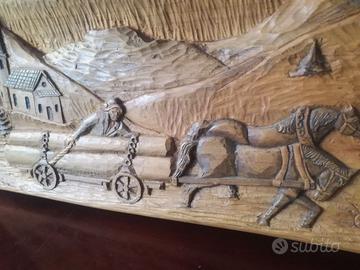 Opera degli anni 80 realizzate dallo scultore Carraro Roberto in arte rocca, realizzato su unico pezzo di legno misure 66cm x 31 spessore 7 cm adatta come supplemento di arredo su locali rustici. Disponibili altre opere
