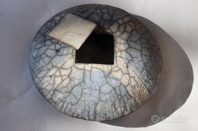 La Scultura o vaso con coperchio o scatola, realizzata in ceramica con la tecnica raku nudo, un pezzo unico fatto completamente a mano di dimensioni 29x6,5 cm, nel retro è riportato il logotipo/firma del ceramista il maestro d'arte Alessandro Balestrieri di Urbino e l'anno di realizzazione 2008