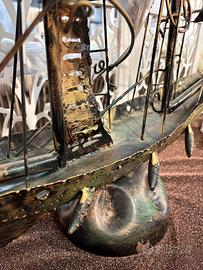 Scultura decorativa raffigurante un veliero a vele spiegate, realizzata in metallo con finitura bronzo anticato. Oggetto di grande presenza scenica, perfetto come punto focale in soggiorno, studio o ambienti in stile vintage, marinaro o industrial chic. Dimensioni importanti: circa 110 cm complessivi. Ideale per chi cerca un elemento d’arredo originale e carattere.