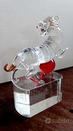 Scultura vintage di cristallo trasparente che rappresenta una Tigre ( segno zodiacale cinese ). La scultura è accompagnata da una sfera rossa, i dettagli sono in oro zecchino e ha una base rettangolare su cui sono incise, in caratteri cinesi, le caratteristiche del segno zodiacale. Il segno della Tigre nell'astrologia occidentale corrisponde al segno dell'Acquario. La scultura è in perfette condizioni.