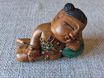 due sculture in legno fatto a mano e colorate raffiguranti una donna ed un uomo addormentati. in buone condizioni come da foto. simboli portafortuna.