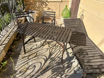 Vendo set di 4 sedie con tavolo e sdraio per giardino estivo Materiale: legno Sedie 4 L 60x 56x 80 h cm Tavolo 125x70x 71 h cm Sdraio con testiera reclinabile e ruote 192x60x 30h cm Possibilità di set cuscini dedicati rossi per sedie e sdraio (50€ aggiuntivi)