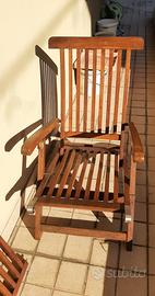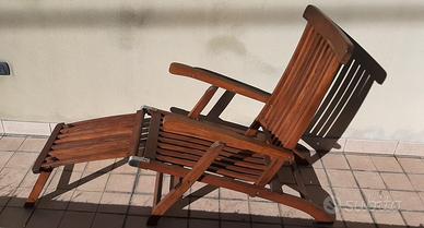 Sdraio in legno per esterno, tenuta bene, con cuscino annesso. Poggia piedi smontabile. Schienale regolabile a varie altezze.