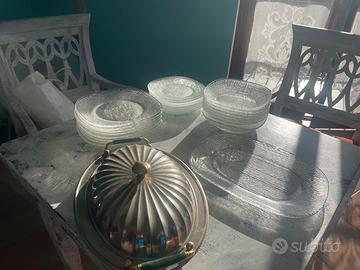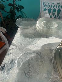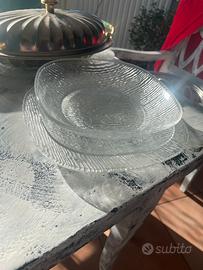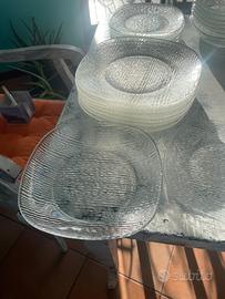 Set di piatti tris composto da minestra, pietanza dessert, vassoio da portata più pietanze in acciaio inox, sono otto pezzi per soggetto vetro trasparente con motivo zigrinato