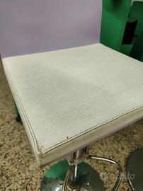 Le sedie hanno lo schienale in legno color lilla, seduta morbida 40x35 rivestita in pelle bianca e struttura in acciaio cromato con altezza regolabile tramite manopola che si trova al di sotto della seduta. (altezza massima sedie 80 cm, altezza minima 60cm)