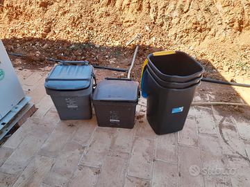 Secchi per la raccolta differenziata di: umido, indifferenziato, carta, vetro, plastica. Questi ultimi 3 oltre a essere impilabili sono praticamente nuovi. Li avevo presi per una casa in campagna ma il comune mi obbliga a prendere i suoi.