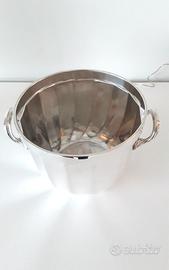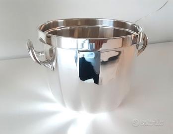 Refrigeratore per vino silver plated degli anni '80 di Ricci Argenterie serie Marengo, oggetto lussuoso e di ottima fattura che unisce il design moderno alla tradizionale lavorazione dell'argento italiano. La placcatura in argento garantisce la durata e la resistenza all'appannamento. Ricci Argenterie, rinomata azienda argentiera italiana, è nota per la sua eccezionale maestria e attenzione ai dettagli. Può essere utilizzato per raffreddare e servire vino, champagne o come secchiello del ghiaccio. Altezza 17 cm., larghezza con i manici 26 cm.