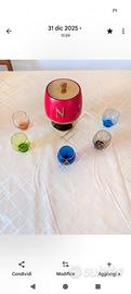 Secchiello per ghiaccio vintage , metallo laccato rosso e ottone , disegnato da Aldo Tura in edizione limitata per cognac Napoleon. Con cinque bicchierini da brandy coordinati