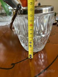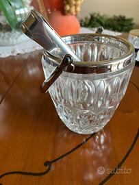 Vendo elegante secchiello portaghiaccio vintage di alta qualità, lavorato con bordo e manico in metallo argentato (non so dire la natura precisa del metallo), completo di pinza originale. Stile anni '60/'70, ideale per angolo bar, tavola retrò o arredamento modernariato. Vetro molto spesso e decorato, in ottime condizioni, senza crepe o rotture. Struttura in metallo ben conservata. Presenta anche una grata al fondo per far scolare l'acqua che si scioglie. Perfetto per aperitivi, cocktail o come oggetto decorativo. Misure in allegato in foto Disponibile spedizione con TuttoSubito e ritiro sul posto, lo mostro volentieri senza impegno