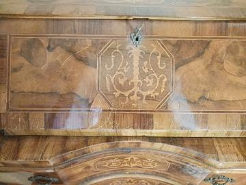 Bellissimo secrétaire in legno di stampo italiano / stile neoclassico, con piano ribaltabile e doppia cassettiera inferiore. Decorato con raffinati intarsi floreali, maniglie in metallo antico e gambe sagomate. Ideale come pezzo da collezione o elegante scrittoio vintage. In discrete condizioni (vd foto), necessita di un piccolo restauro. Dimensioni circa 100×50×110cm.