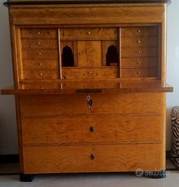 Il mobile si presenta con ribalta a scrittoio, ampio piano apribile e numerosi cassetti interni ed esterni, ideali per custodire documenti e oggetti preziosi.