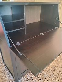 Scrittoio a ribaltina, Ikea 2021. Colore nero. Misure: altezza 108 cm., profondità massima chiuso 45.5 cm., profondità massima aperto 77 cm., larghezza 89. Buonissimo stato, leggera imperfezione sulla ribaltina (ved. foto).