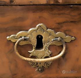 Bureau georgiano del 1800, in rovere con inserti di quercia, con cassetti grandi e piccoli. All'interno della ribalta ci sono cassettini interni, scomparti e un piccolo armadietto centrale. Lo Stato è ottimo, con aloni sul piano superiore.