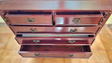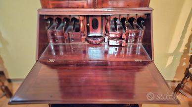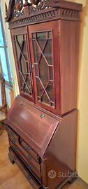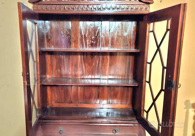 Mobile in mogano in stile Giorgio III. Composto da una parte inferiore con cassetti e piano scrittoio a ribalta, e una parte superiore con vetrina. Caratterizzato da finiture eleganti e decorazioni elaborate sulla parte superiore. Misure: larghezza 95cm, profondità 57cm e altezza 250cm. Il mobile si trova in Parma centro in un appartamento al terzo piano (senza ascensore)