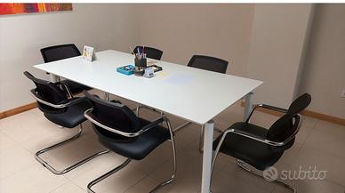 È una sedia da ufficio/attesa dal design moderno e funzionale. La struttura è in metallo cromato, con una base a slitta (senza ruote) che le dà stabilità e un aspetto leggero. I braccioli sono integrati nella struttura e rivestiti nella parte superiore con un materiale nero (probabilmente plastica o gomma) per maggiore comfort. La seduta è imbottita e rivestita in similpelle nera, liscia e leggermente opaca, pensata per essere comoda ma anche facile da pulire. Lo schienale invece è in rete (mesh) nera, leggermente curvato per adattarsi alla schiena e favorire la traspirazione. Nel complesso è una sedia essenziale, elegante e pratica, tipica di sale riunioni, studi professionali o sale d’attesa. 6 sedie ( 100 ciascuna)