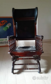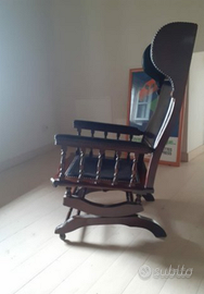 Sedia a dondolo americana in legno marrone con rivestimento in pelle nera.
