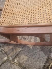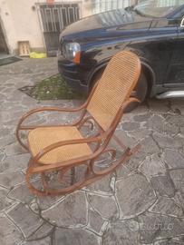 Sedia a dondolo usata ma molto buona. Telaio in faggio e imbottiture in midollino. Come vedete nell'ultima foto c'è stata una crepa però restaurata che non compromette per niente il telaio.