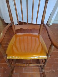 Vendo elegante sedia a dondolo in legno massello, con schienale a stecche verticali e braccioli sagomati, finitura calda color noce.