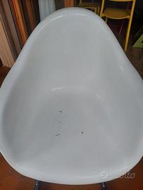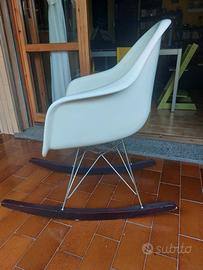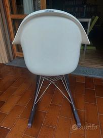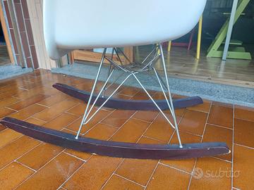Sedia a dondolo ispirata a Eames Plastic Armchair, colore bianco. La sedia presenta dei difetti dovuti all'usura (vernice della seduta e legno degli appoggi rovinati in alcuni punti, come visibile nelle foto), ma lo stile rimane inconfondibile. Ritiro a domicilio.