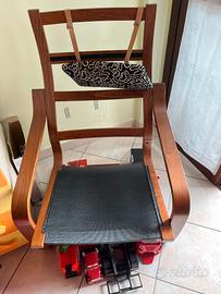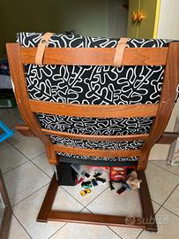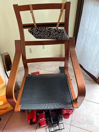 Sedia a dondolo Poäng in legno rovere marrone con cuscini neri con motivo a foglie bianco. Usata molto poco, per lo più per appoggiare vestiti. Vendo perché non si abbina con il nuovo arredamento delle camere.