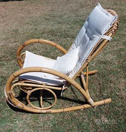Sedia a dondolo in bambù anni 70, ben tenuta, in ottime condizioni. Misure h.87, prof. 120, l.60. Completa di cuscino praticamente nuovo.