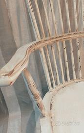Il punto di forza è l'esclusiva finitura Shabby Chic. La vernice bianco latte è stata sapientemente lavorata con tecnica di decapaggio manuale: le abrasioni controllate lungo gli spigoli, sulle volute dei braccioli e sulla seduta non sono segni di usura, ma dettagli estetici ricercati. Questo contrasto cromatico tra il candore del bianco e le venature calde del legno sottostante crea un gioco di texture che dona profondità e carattere al pezzo.