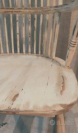 Questa sedia si distingue per una silhouette slanciata ed equilibrata. Lo schienale, caratterizzato da una sequenza ritmica di sottili stecche verticali, conferisce un senso di leggerezza visiva pur mantenendo una struttura solida. La linea superiore della spalliera presenta una curvatura dolce e accogliente, che richiama lo stile Windsor rivisitato in chiave provenzale. I braccioli ampi e sagomati seguono la naturale postura del corpo, chiudendosi con un invito arrotondato che ne sottolinea la manifattura artigianale.