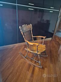 Sedia a dondolo in legno massello con schienale a stecche e decorazioni intagliate nella parte superiore.