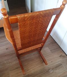 Bellissima sedia a dondolo in legno, stile Kennedy Rocker (ultima foto). Come nuova, in eccellenti condizioni. Robusta e comodissima. Vendo a mio malgrado per mancanza di spazio. Dimensioni (leggermente larghe per via del dondolio): 70 larghezza x 90 profondità x 125altezza