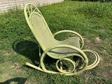 Scenografica sedia a dondolo in vimini. Bellissima come elemento decorativo in giardino. Grande e comoda, colore verde. Misure 110 altezza, 130 lunghezza , 60 larghezza Presenta delle scorticature come in foto.
