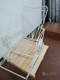 Sedia a dondolo in ferro battuto , verniciato di bianco.