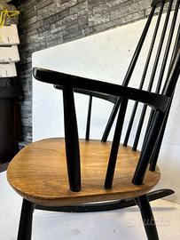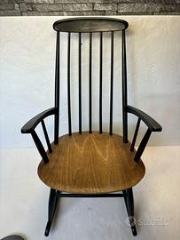 Questa splendida sedia a dondolo scandinava degli anni ’50 emana semplicità ed eleganza. Il design è minimalista, caratterizzato da linee pulite e un aspetto leggero e arioso. Lo schienale alto con colonnine sottili offre un sostegno confortevole, mentre i braccioli leggermente curvati contribuiscono a un design ergonomico. La seduta, solida e realizzata in legno con una finitura calda e naturale, crea un piacevole contrasto con la struttura.