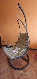 Sedia a dondolo sospesa in acciaio verniciato a polvere grigio con altezza seduta circa 55 cm, portata massima 100 kg; imbottitura verde in poliestere leggero lavabili adatta per patio o giardino o interni. Senza scatola originale ma con istruzioni montaggio/smontaggio.. Prezzo trattabile, da ritirare in sede