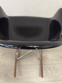 Vendo sedia a dondolo in stile Eames (modello RAR) con scocca nera in plastica rigida, base in metallo cromato e slitte in legno. Design elegante e iconico, perfetta per ambienti moderni o creativi.